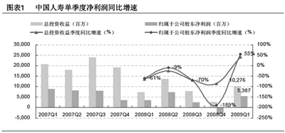 平安证券的研究报告表示,股市反弹支持国寿投资收益。截至2008年底,公司股票和基金合计占比7.98%。2009年以来,上证指数和沪深300指数分别累计上涨35.3%和42.7%,权益投资实现超额收益。公司一季度实现总投资收益103亿元,同比增长41%,总投资收益率为1.04%。截至3月11日,公司减持中信证券4502万股,按年内日均股价23.02元/股作为交易价格,可以实现每股收益0.02元。基于2009年底上证指数2367(上涨30%)和中证国债127点(下跌2.15%)的假设,预计2009年总投资收益率4.65%。公司一季报资本公积较上年底增长8.8%,净资产较上年底增长8.1%。预计09年底净资产同比增长16%,为5.56元/股。