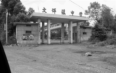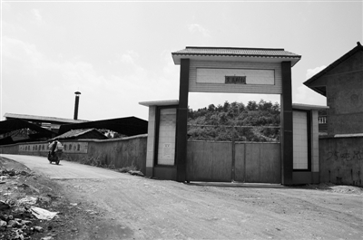 ②没有挂任何牌子的湖南省武冈市精炼锰加工厂,大门上方的“招财进宝”四个大字格外醒目。