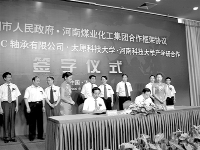 右图:2009年6月30日,河南煤业化工集团与洛阳市政府签订合作框架协议,全力推动新洛轴工程建设,打造国内第一、世界一流的轴承制造企业。