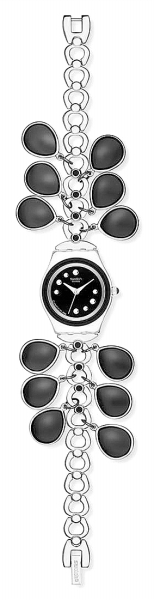 腕上奏响黑珍珠舞曲 灵动的大颗黑珍珠展现了午夜的神秘魅力。Sw atch这款充满诱惑力的金属淑女型(IronyL adyL ady)腕表以金色表链精致相扣,饰以饱满的露珠形半透明黑色珍珠,玲珑中流露出雅致性感。闪光黑色表盘上,熠熠生辉的8颗白水晶以独特的对称方式镶嵌,清丽的色泽让人过目难忘。 |