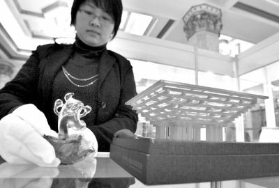 1月5日,工作人员展示上海世博会中国馆水晶模型和琉璃“海宝”。 当日,将在上海2010年“蓝天下的至爱———‘点亮心愿’慈善义拍”上拍卖的近百件拍品对公众开放预展,其中包括琉璃“海宝”、世博会中国馆水晶模型和姚明亲笔签名的篮球等。上海“点亮心愿”慈善义拍是一项面向社会征集拍品拍卖以救助贫困患者的慈善项目,自2000年发起至今已举办10届。 新华社发(范筱明 摄) |