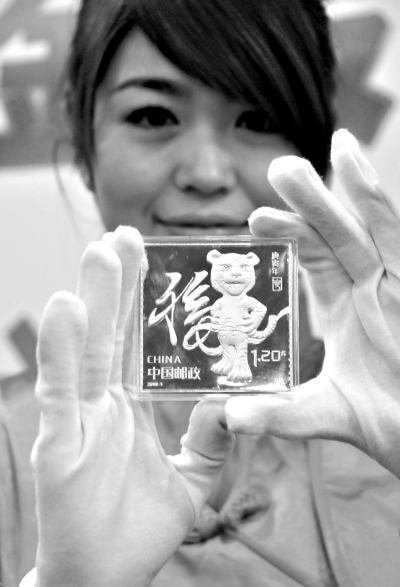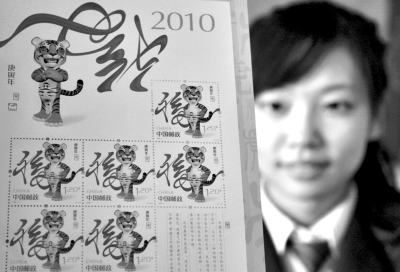 2010年1月5日是中国邮政生肖邮票发行30周年纪念日,中国邮政集团公司《庚寅年》特种邮票(虎票)首发式在天津市东站邮政局举行。虎年首日封、宣纸封等纪念邮品亮相首发式,同时启用“虎丘路(临)”字邮政日戳,为邮迷现场加盖留念。 据介绍,《庚寅年》特种邮票首次在生肖邮票设计中采用了3D软件制作技术,面值1.2元,背衬“福”字,两爪叉腰的三维卡通拟人老虎形象,象征着建国60年来中国人民的精神面貌,后衬“福”字,更寓意着民富国福。30年来,生肖邮票的发行对中国文化以及生肖文化产业产生了深远的影响。 新华社发 李想 摄 |