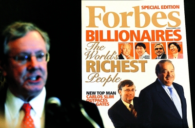 3月10日,《福布斯》杂志总编辑史蒂夫·福布斯在美国纽约出席新闻发布会。当日,《福布斯》杂志在纽约总部举行新闻发布会,揭晓2010年度亿万富豪榜单,墨西哥电信大亨卡洛斯·斯利姆·埃卢超过微软创始人比尔·盖茨荣登榜首,这也是16年来美国人首次失去全球首富头衔。 新华社记者 申宏 摄