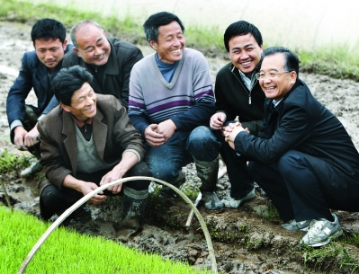 这是4月10日,温家宝在池州市贵池区梅龙镇和当地农民一起察看早稻育秧情况。