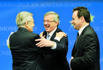 5月2日,在比利时首都布鲁塞尔举行的欧元区成员国财政部长会议后的新闻发布会上,欧元集团主席、卢森堡首相容克(中)拥抱欧洲央行行长特里谢(左),希腊财政部长帕帕康斯坦季努站在一旁。当天,欧元区财政部长同意在未来的三年内为希腊政府提供800亿欧元贷款,以帮助陷入债务危机的希腊渡过难关。 新华社记者 武巍 摄(详见今日四版)