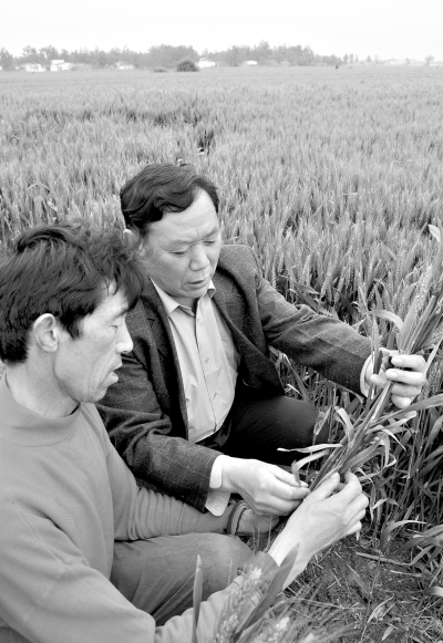 ▲5月9日,河南省驻马店市驿城区农业技术推广站技术员胡福流(右)在田间为农民指导农业生产。                          新华社记者 朱祥 摄