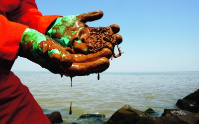 5月17日,在美国路易斯安那州,一名环保志愿者在密西西比河入海口处抓起一把海水里的油污。