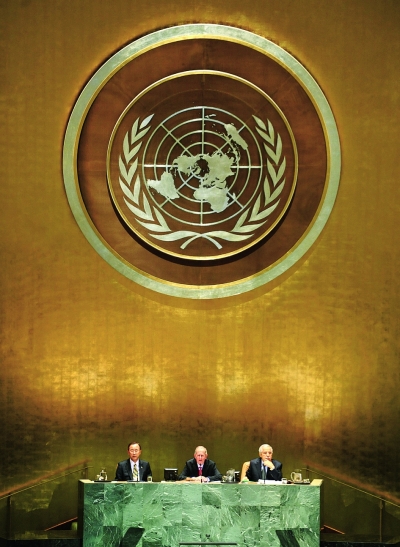 图为联合国秘书长潘基文(左)、第65届联大主席约瑟夫·戴斯(中)、第64届联大主席图里基出席会议。 新华社记者 申宏 摄