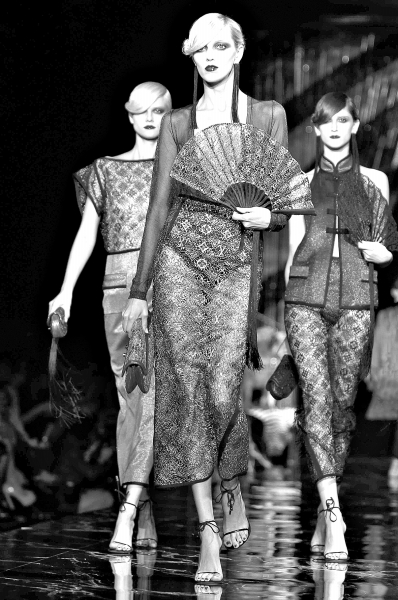具有中国少数民族特色的配饰、表现在剪裁中的中国旗袍样式、空灵的中国民乐伴奏———这场民族韵味十足的时装秀,在众多欧洲时装作品展示会中显得独树一帜、别具一格,给英国观众带来很强的视觉冲击。