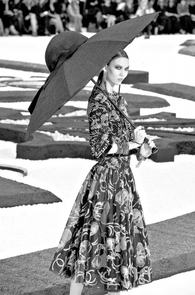 法国著名品牌香奈儿首席设计师卡尔·拉格费尔德则在本季成衣系列中娴熟自然地使用了黑白对比色,仿佛把人们带回几十年前可可·香奈儿创造的那个经典年代。