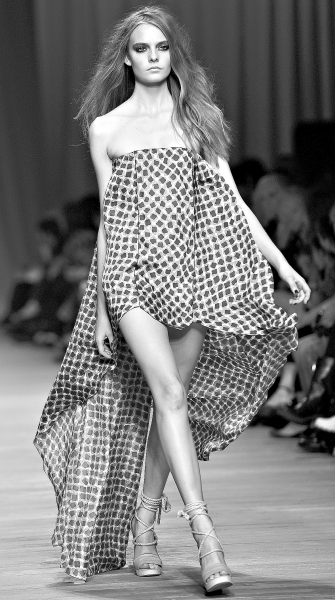 著名华裔服装设计师王薇薇在时装秀上共展示了44件作品,其中连衣裙加拖尾裙摆可谓一大特色。设计师秉承了她一贯简洁流畅、轻盈柔美的风格,用梦幻般的半透明薄纱和飘逸的垂坠面料打造出立体感十足的春装系列。除了在裙摆线条上做文章,设计师在腰部设计也十分考究。日本和服似的腰带以及别出心裁的褶皱设计,尽显神秘的东方色彩。