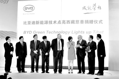 签约现场见证了这一善举的巴菲特、盖茨先生对比亚迪给予了高度评价:比亚迪不仅投入财富关爱社会、履行责任,更重要的是比亚迪用技术创新为社会提供更节能、更环保的低碳产品,为西藏人民带去了光亮和欣喜,更为全球带来了一份绿色的希望。