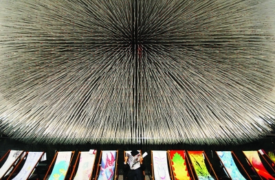 10月28日,游客在世博园英国馆的装有种子的亚克力“触须”前休息。