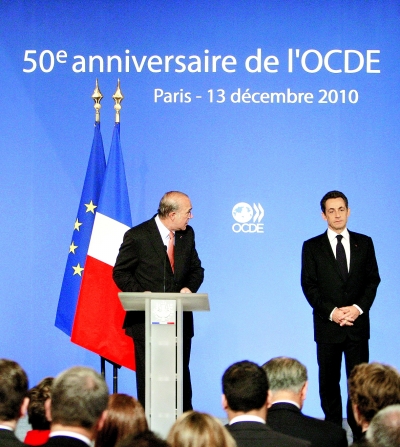 总部设在巴黎的经济合作与发展组织(简称“经合组织”,O EC D)13日在法国总统官邸爱丽舍宫举办成立50周年招待会。图为经合组织秘书长安赫尔·古里亚(左)和法国总统萨科齐在招待会上发表讲话。该组织当天公布的欧元区经济评估报告指出,欧元区贸易失衡和债务危机为后期经济发展蒙上阴影,目前地区层面的金融监管和财政纪律都有待加强。经合组织是成立于1961年的一个政府间国际组织,成员多为欧美和亚洲的经济发达国家。 法新社