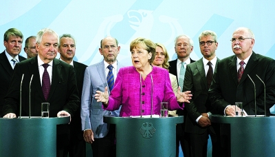 5月30日,在德国首都柏林,德国总理默克尔(中)在接受能源供应安全伦理道德专家委员会递交的《德国的能源转折》报告书前发表讲话。