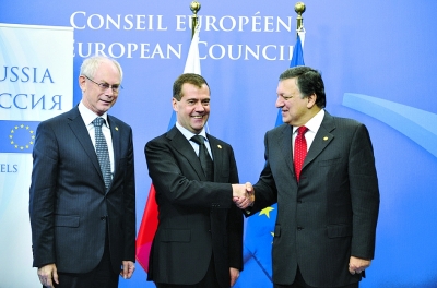 图为15日第28届欧盟—俄罗斯峰会在布鲁塞尔举行,欧洲理事会主席范龙佩(左)与欧盟委员会主席巴罗佐(右)欢迎俄罗斯总统梅德韦杰夫。 新华社记者 叶平凡 摄