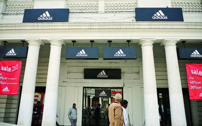 1月11日,在印度首都新德里,顾客从一家阿迪达斯零售店前走过。