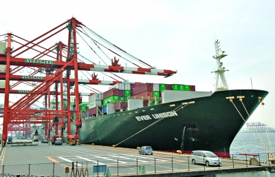 7月25日,一艘货轮停靠在日本东京大井集装箱码头。