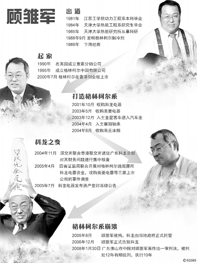 公开资料显示,1988年发明格林柯尔制冷剂之后,顾雏军次年下海经商,1990年在英国成立了首家分销公司,1995年成立了格林柯尔中国有限公司。2000年7月,顾雏军一手创办的格林柯尔在香港创业板上市。当年10月,格林柯尔收购科龙电器。2001年科龙巨亏15亿元,但2002年却奇迹般地扭亏为盈,并且实现净利润1 .01亿元。仅仅在两年后,顾雏军拥有全资股份的顺德格林柯尔成功入主上市公司美菱电器,成为其第一大控股股东。