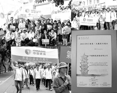 以2012年为例:2月17日,中国燃气向抚顺捐资800万元,支援抚顺生态建设;6月1日,携手中国经营报社,共同发起“点燃希望 让爱传递”孔明灯公益项目,派出多批志愿者深入湖南、四川等贫困山区收集贫困儿童心愿,并帮助他们实现;8月6日,向盖州市捐款100万元,用于特大暴雨过后的抗洪救灾工作;11月13日,向宿州市政府捐赠了价值500万元的10辆天然气公交车。在北京召开的“2012(第十届)中国企业竞争力年会”上,中国燃气凭借多次主导、参与社会公益活动,积极承担企业的社会责任,荣膺“最佳爱心贡献奖”。