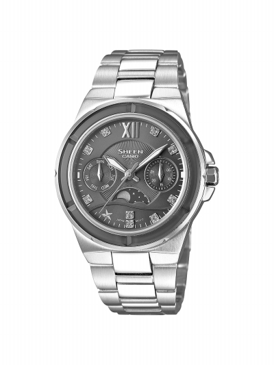 演绎月之动态 卡 西 欧S H E - 3500D -4A奢华系列的点 睛 之 笔 是6点 钟 位 置 的 月相 显 示 , 独 特而 富 有 趣 味 性的 设 计 将 月 亮的 动 态 演 绎 得淋 漓 尽 致 , 更将 浩 瀚 星 空 中的 无 穷 变 幻 潜藏 其 中 , 让 你随 时 掌 握 月 相盈 亏 。7点 钟位 置 代 表 小 时刻 度 的 星 星 ,明亮闪耀,仿佛在立体文字板上,沿着波浪线条向着月亮滑动,灵动流畅的氛围,充满动感的画面,让整个表盘熠熠生辉。镶有施华洛世奇水晶的多角度切割表把则在动静之间,闪动着若隐若现的光芒。 |