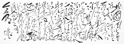 先说其“大”。其作品尺幅之“大”实属罕见,丈二匹、八尺整张,最大的由丈八纸、十八张一个整体。三十六米长、五米高的“九州颂和谐图”,十米高、十六米宽的“九州隆祥图”,其笔墨之“大”如椽“大”笔,横扫千军。而这只是其表面,其根本在于他的气局之“大”、气势之“大”、魄力之“大”,如有“上下千年,纵横万里,目空四海”之气概。展开画卷,便有一种“大风起兮云飞扬”的“大”气磅礴,扑人眉宇,摄人心魄。