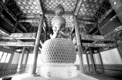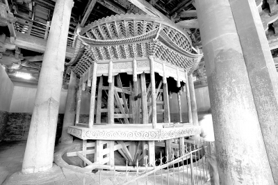 最古老的转轮藏 转轮藏直径七米,是一座收藏经文的旋转书架,外观形似八角形亭子,中设木轴,亭身设有经屉,可以存放佛经,推之可转动。取佛教“法轮常转,自动不息”之意,喻佛法犹如轮子辗转相传,永不停息。佛教中亦有推其旋转与诵读经文同功之说。这种建筑形制国内保存下来的甚少,主要有四川平武报恩寺华严店和北京智化寺藏殿的明代转轮藏、北京颐和园万寿山和山西五台山塔院寺大藏经阁清代转轮藏、正定隆兴寺转轮藏阁内的宋代转轮藏,因此称其是中国现存最早的转轮藏。