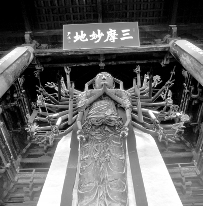 最高大、最古老的千手千眼观音 大悲阁是隆兴寺的主体建筑,阁内供奉闻名遐迩的宋代铜铸“千手千眼观音菩萨”,俗称“正定府大菩萨”。它为北宋开宝四年(971)奉太祖赵匡胤之命铸造。像高21 .3米,共42臂,除本身的两只手、眼外,在身体左右各有20只手,分别执日、月、净瓶、金刚杵、宝剑等法器。铜像身躯高大,比例适度,其形体之巨、雕工之细实为罕见,是世界上古代铜铸佛像中最高大、最古老的千手千眼观世音菩萨像。