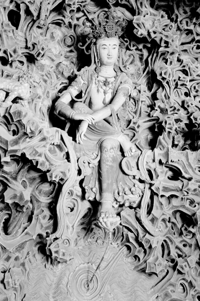 最美五彩悬朔观音像 摩尼殿内槽北壁为一座宋代的泥塑五彩悬山,悬山上共有佛像30余身,最引人注目的还是端坐于中间的五彩自在观音像,俗称“倒坐观音”。观音像高3.4米,左足踏莲,右腿踞起,两手抱膝,身体稍向前倾斜,面容秀丽恬静,姿态优雅端庄。柳眉之下,那双智慧深邃的眼睛微微俯视,恰与礼佛者仰视时形成感情上的交流。这人性化了的佛像被鲁迅先生称为“东方美神”。
