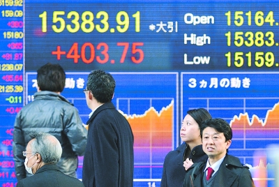 受日元对美元汇率走低、隔夜美股全线上扬以及投资者逢低买入等多重利好因素提振,29日东京股市结束连跌且大幅回升,日经225种股票平均价格指数较前一个交易日上涨2.70%。到收盘时,日经股指上涨403.75点,收于15383.91点。图为当日行人经过东京显示日经股指的屏幕。 新华社/法新
