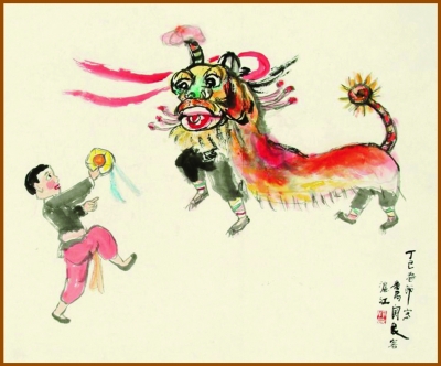 人们都爱在锣鼓梆钹声中舞狮助兴,登门叩头,咚咚锵锵,热闹非常。