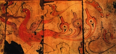 若细心一些,便会发现,“仙人骑凤”并不只出现在明清屋脊上,而是自古以来形成的一种形象,以陶器、玉器、丝织品、绘画或者文字记载的形式出现在早至先秦,迟至明清的各个时代的艺术品里。如汉代羽人形象在漆画和画像石中大量出现,卜千秋墓与马王堆墓中的绘画中不约而同地出现了骑乘凤鸟向仙境飞去的情境,这无不表达汉代神仙思想的影响,人们认为凤鸟是灵魂通往仙境、到达神仙彼岸的纽带。尔后凤凰的发展也越来越多地出现在佛教艺术中,在世俗与装饰意味颇浓的唐代,华丽的仙鸟背上出现了佛家弟子、飞天等形象。唐代成就至高的铜镜艺术中,真子飞霜镜、吹笙引凤的纹样和题材又让人陷入开放而多彩装饰的想象世界。而来到明清,凤鸟的神秘感渐渐消失,更多地接了“地气儿”,所骑之鸟也不仅限于凤,鸡也成了充满民俗风的新潮“坐骑”。骑鸡的形象也正是在此时极具戏剧性地登上了中国最高等级的建筑屋顶。同时,也有一个非常民俗情趣的解释:“骑鸡”正是“骑吉”。