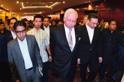 图为纳吉布(中)离开发布会现场。 新华社发(张纹综摄)