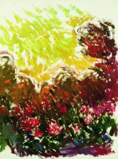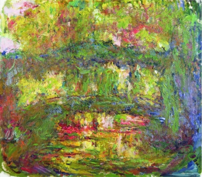 1911年妻子的去世使莫奈变得孑然一身,“画画的时候我不时地想着她”。然而悲伤因为眼疾的忧虑而加重。1912年,莫奈被告知患上了白内障。晚年的莫奈谈及自己梦想的室内装饰设计时说:“我花费了八九年时间,一步也没有离开,后来由于难言的悲痛我不得不突然停止工作。”经历治疗与调整后他“试图恢复调色板上消失了的新鲜色彩,但是精力白费,徒劳无益。我的油画变得越来越浓暗,越来越像古典大师的作品……当尝试结束,我把它同以前的作品相比较,我被疯狂的愤怒压倒了,用小刀把所有的画布都割破了”。这一时期他画面上的那座日本式拱桥也覆盖着厚重的藤索,浓暗深沉。