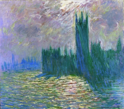 “一天夜里,我的噩梦一个接着一个;我梦见笔下的教堂不知怎么倒了下来,压在我身上;其颜色好像变成了蓝色,但很快又变成玫瑰色,最后竟又变成了黄色。”干草垛、教堂、国会大厦,他的很多画幅都是以系列形式呈现,不厌其烦地表现同样的物体。建筑本身被厚厚的冷色光影所包裹,令人目眩。