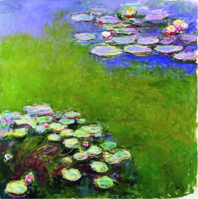 1895年,莫奈画了第一张有日本桥的画,到1900年共 画 了18张 日 本桥。1900年底,莫奈 初 次 展 出 他 从1899到1900年的《 睡 莲 》 , 共13幅。睡莲绘画是莫奈晚年最后的创作活动,画上的睡莲若隐若现,浮在水面延绵不绝,与其年 轻 时 的 作 品 相比,显得更加地安静与温和。晚年的莫 奈 几 乎 足 不 出户 。 在 近2 0年间,他常把画架支在水边,一连几个小时静坐在睡莲池畔 , 描 绘 不 同 季节、不同气候和一天不同时刻里,花与水在光的闪烁与风的流动中变幻颤动的效果。