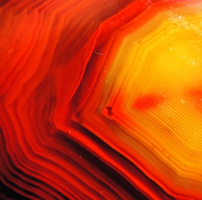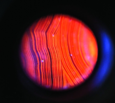 1.层叠;战国红主要的结构即是不同颜色的玛瑙色层叠加在一起,色层薄厚变化多端,分界清晰,极少出现两色混合的现象。当色层按一定规律多层叠加,就形成了缠丝结构,战国红缠丝多折角,且多呈锐角结构。战国红多为红黄色层叠,色层中会有过渡色出现,也有掺杂其他颜色,如紫、绿、白、黑等。