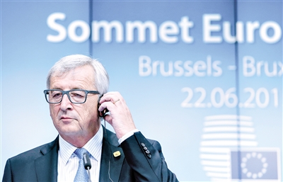 图为欧盟委员会主席容克出席新闻发布会,他表示,希腊政府向国际债权人期望的方向走出重要一步,“我坚信本周将完成这个(债务谈判)进程”。新华社记者 周磊 摄
