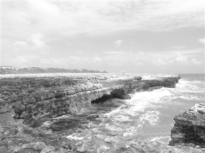 所谓的“鬼桥”并非一座人为修建的桥,而是经过海水的常年冲刷,在一片灰突突的石灰岩上形成了一个天然的拱形,如同一座拱桥一般。若是正值难得的大风天,海浪被狂风呼啸地卷起,拍打在悬崖峭壁上,一时间飞起千层浪花,如同无数颗珍珠越出海面,十分壮美。