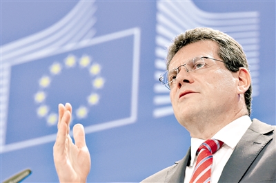 7月1日,在比利时布鲁塞尔,欧盟委员会副主席马罗什·谢夫乔维奇召开关于乌克兰、俄罗斯和欧盟三方天然气问题谈判的新闻发布会。