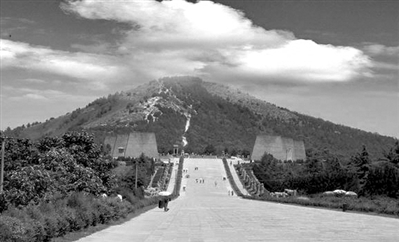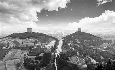 梁山有三峰,北峰最高,即乾陵,南二峰较低,称东、西乳峰,为乾陵之天然门户。整个山势,远远望去宛若一位仰卧于天地之间,头枕梁山,脚蹬渭河,双乳丰隆,体态优美的睡美人。古之帝王陵前,均有乳台,唯乾陵依托山势,筑台建梯,形如奶头,逼真宛然,故当地又叫“奶头山”。若拾阶登乳峰,可尽收关中秀色于眼底:南望渭水如带,北看群岭叠翠,东眺川原平地,西穷漠谷云烟,凝目临风,飘飘然有凌云之感。郭沫若先生1960年来乾陵游览时,曾留下了“南对乳丘思大业,下临后土望长安”之佳句。