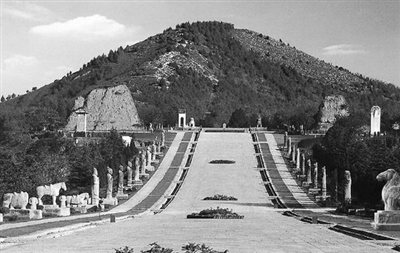 此景距县城6公里,与乾陵浑然一体,乾陵朱雀门南面从两乳峰之间通向献殿的御道两侧,竖有华表,石马(翼马)、驼马、翁仲、述圣纪碑、无字碑、石狮、六十一宾王等大型精细石雕,120多尊依次排列。石马在前,双翅高振,凌空欲飞,栩栩如生,其他石雕左右配置,紧随其后,魁梧奇伟,气象万千。