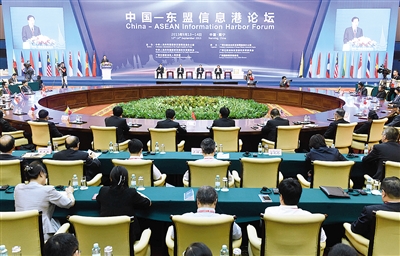 9月13日,广西南宁市中国-东盟信息港论坛开幕仪式现场。 当日,中国-东盟信息港论坛在广西南宁市开幕,主题为“互联网+海上丝绸之路——合作·互利·共赢”。中国-东盟信息港论坛由国家互联网信息办公室、国家发展和改革委员会与广西壮族自治区人民政府共同主办。论坛为期两天,来自中国及东盟十国的280多位政府、企业和学术界代表参加论坛。 新华社记者 周华 摄