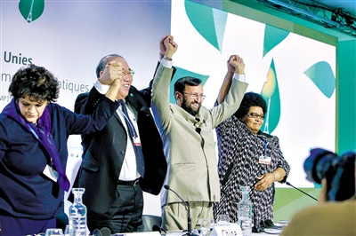 12月8日,在法国巴黎北部市郊布尔歇展览中心举行的新闻发布会上,中国气候变化事务特别代表解振华(左二)与巴西环境部长特谢拉(左一)、印度环境、森林和气候变化部长贾瓦德卡尔(右二)、南非环境事务部长莫莱瓦(右一)一同挽手致意。