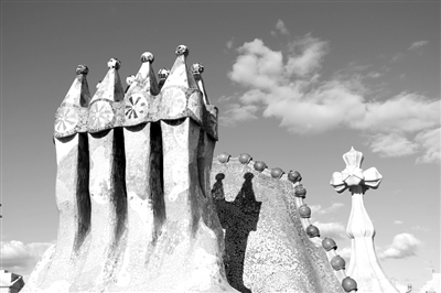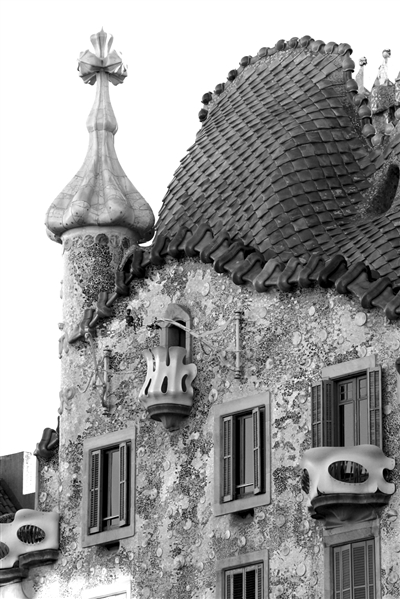 高迪改造的巴特洛之家,建于1904年—1906年,整幢房子中最为精华的部分位于一楼的主厅,这里是巴特洛全家住的地方。它有单独的入口和楼梯,体现了典型的高迪风格。其屋顶代表着圣乔治和龙,高迪在这里似乎营造了一个属于童话中的世界,自然以一种全新的方式展现在人们眼前,四成为了舞台上的主角,想象得以自由驰骋。巴特洛之家本身就是一个故事,高迪的灵感便来源于此。一位美丽的公主被龙困在城堡里,加泰罗尼亚的英雄圣乔治为了救出公主与龙展开了搏斗,用剑杀死了龙。龙的血变成了一朵鲜红的玫瑰花,圣乔治把它献给了公主。所以这座房子的每一个设计都有着特殊的含义。十字架形的烟囱代表着英雄,鳞片状拱起的屋顶是巨龙的脊背,房子的外立面用彩色瓷片镶贴,像是长满龙鳞的龙身,而整座建筑也是以水为主题,在每一个房间里都好像置身于一个奇妙的海底世界。