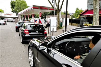 5月26日,车辆在法国巴黎的一处加油站排队等待加油。 法国政府负责交通事务的国务秘书阿兰·维达利25日向媒体证实,因炼油厂与油库员工罢工造成法国燃料短缺,法国开始动用国家战略石油产品储备,已动用115天储备量中的3天储量。近来,为逼迫政府撤回劳动法修改草案,法国部分炼油厂与油库员工举行罢工。全国1.2万个加油站中目前已有至少1500个汽油售完或部分短缺,一些