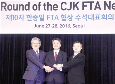 6月27日,在韩国首尔,(从右至左)中国商务部副部长王受文、韩国产业通商资源部部长助理金学道和日本外务省外务审议官片上庆一在会议前合影。 当日,中日韩自贸区第十轮谈判首席谈判代表会议在韩国首尔举行。在为期一天半的谈判中,三方将就货物贸易、服务贸易、投资、协定领域范围等议题深入交换意见。 新华社记者 姚琪琳 摄