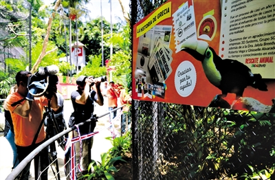 8月10日,在哥斯达黎加阿拉胡埃拉省,媒体记者在巨嘴鸟格雷西亚的鸟舍外拍摄。 10日在哥斯达黎加阿拉胡埃拉省的一家动物救助中心,一只名为格雷西亚的巨嘴鸟在装上3D打印新喙后首次与媒体见面。去年,格雷西亚遭人虐待,上喙被折断,随后被送到这里接受救治。动物专家和3D打印公司经过多次试验,终于为它装上3D打印的新喙。新华社发(肯特·吉尔伯特摄)
