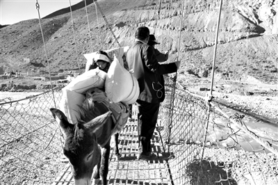 斜尔瓦口岸的一座铁索吊桥跨河而过。临近黄昏,河对岸尼泊尔境内的空地上每隔5分钟有一架直升飞机起飞。这是一个现代和原始画面的交织:尼泊尔籍的背夫不断地将堆积在岸边的货物送到对岸的尼泊尔湖木拉县的一个小村庄。驮着货物的还有一队毛驴。而直升飞机是把来普兰朝拜神山圣湖的印度香客接走。摇晃的吊桥仅容两人擦肩而过,穿梭着背夫、香客和毛驴。