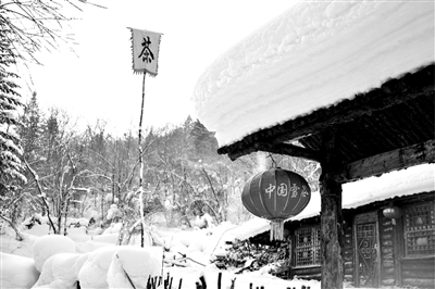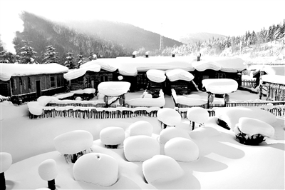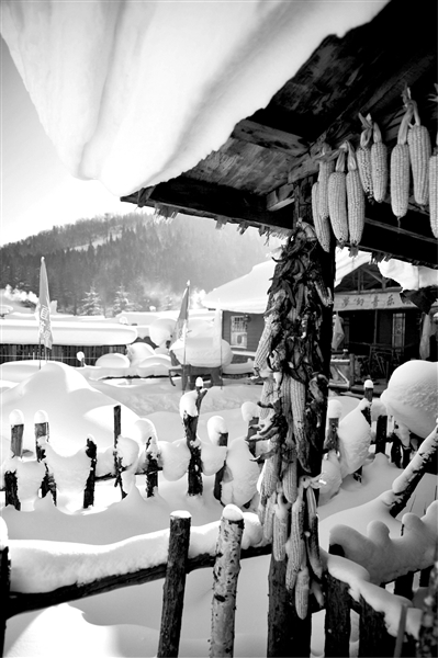 雪乡的雪美得奇特,美得让人不敢相信,真像童话故事和画片中所描述的那样,厚厚的白雪覆盖的小村子连绵起伏,涌起像蘑菇一样的座座小房子,在房顶和拌子垛上卷起一层层雪檐,她们就像刚长出来的一株株矮矮胖胖的“雪蘑菇”,慵懒而立。老房子外面的小院都是用木栅栏围起来的,线条简洁而不规范,如同炭笔画漫不经心的勾勒。当栅栏的木枝披上银色外衣之后,则酷似一根根即将融化的奶油冰棍,与中间的“蛋糕”相映成趣。房顶、大地、山上隆起的雪堆和线条柔润如棉絮,洁白像陶塑银雕,在阳光映照下变幻万千,韵味无穷。家家户户贴满五颜六色的挂线春联,挂起串串红灯,把那素雅的银装世界装点映衬得更加美丽生动。